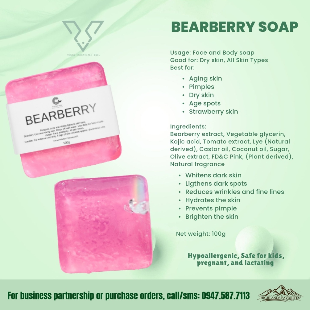 Bear Berry Soap is a Vegan Soap by Vegan Essentials Incorporated, which can be use for face and body soap. This is good for dry skin, All Skin Types. Best for aging skin, pimples, dry skin, age spots and strawberry skin.